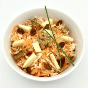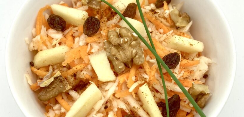 Voici une version qui change de la recette traditionnelle américaine avec une sauce plus légère et des fruits secs pour bien commencer la saison automnale !Cette salade est simple, rapide à faire et très savoureuse ! Alors n'hésitez plus et testez cette recette !